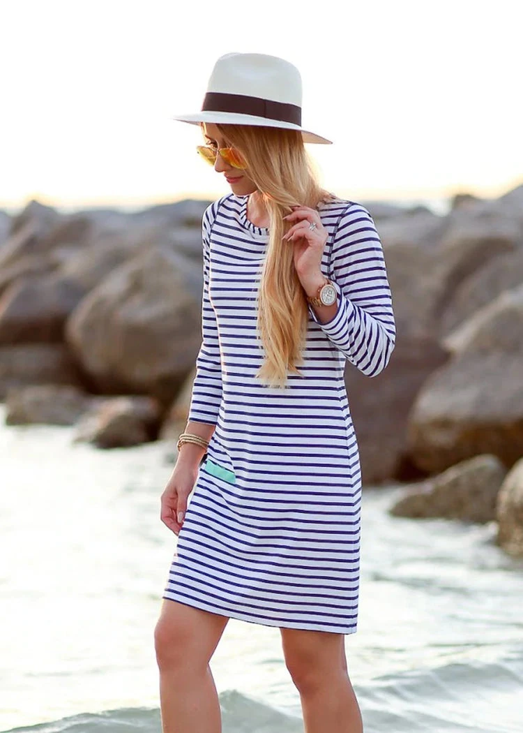 The Cabana Life signature shift dress is a flattering, relaxed silhouette that is a must-pack travel essential. The classic boat neck dress is lightweight, breathable and multifunctional. Wear it dashing or splashing around, and see why everyone loves this versatile dress. Pair this striped print with metallic sandals and aviators for a polished look when you’re jet-setting around town. All Cabana Life sun protective clothing provides 50+ UV protection.