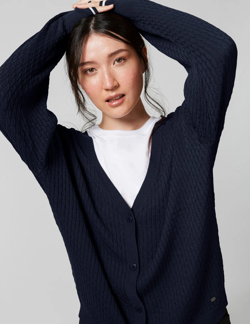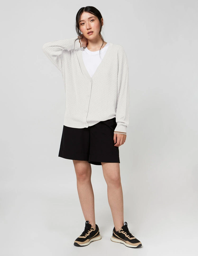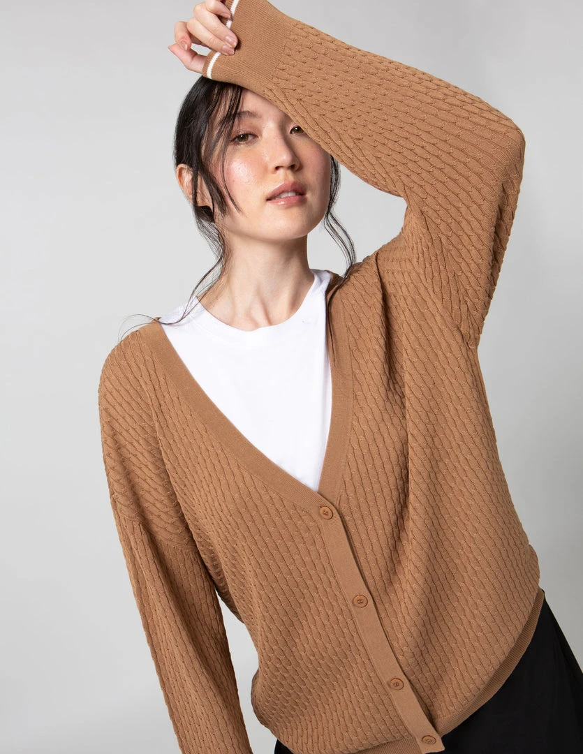 FIG Courcelles Cardigan, a long sleeves cardigan with button closure made with TENCELâ„¢ Modal, sourced from sustainable beech wood and produced in an environmentally responsible pulp to fiber process. Cable knit cardigan with dropped shoulder sleeves and rib at hems.