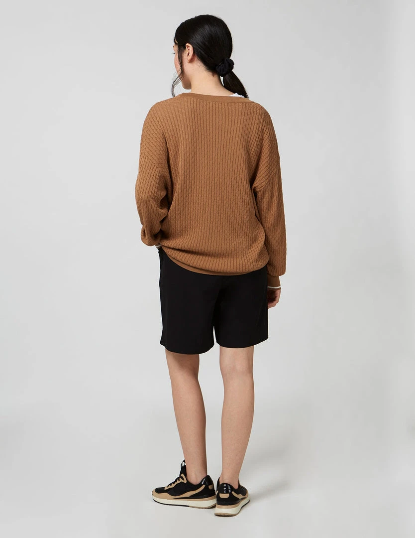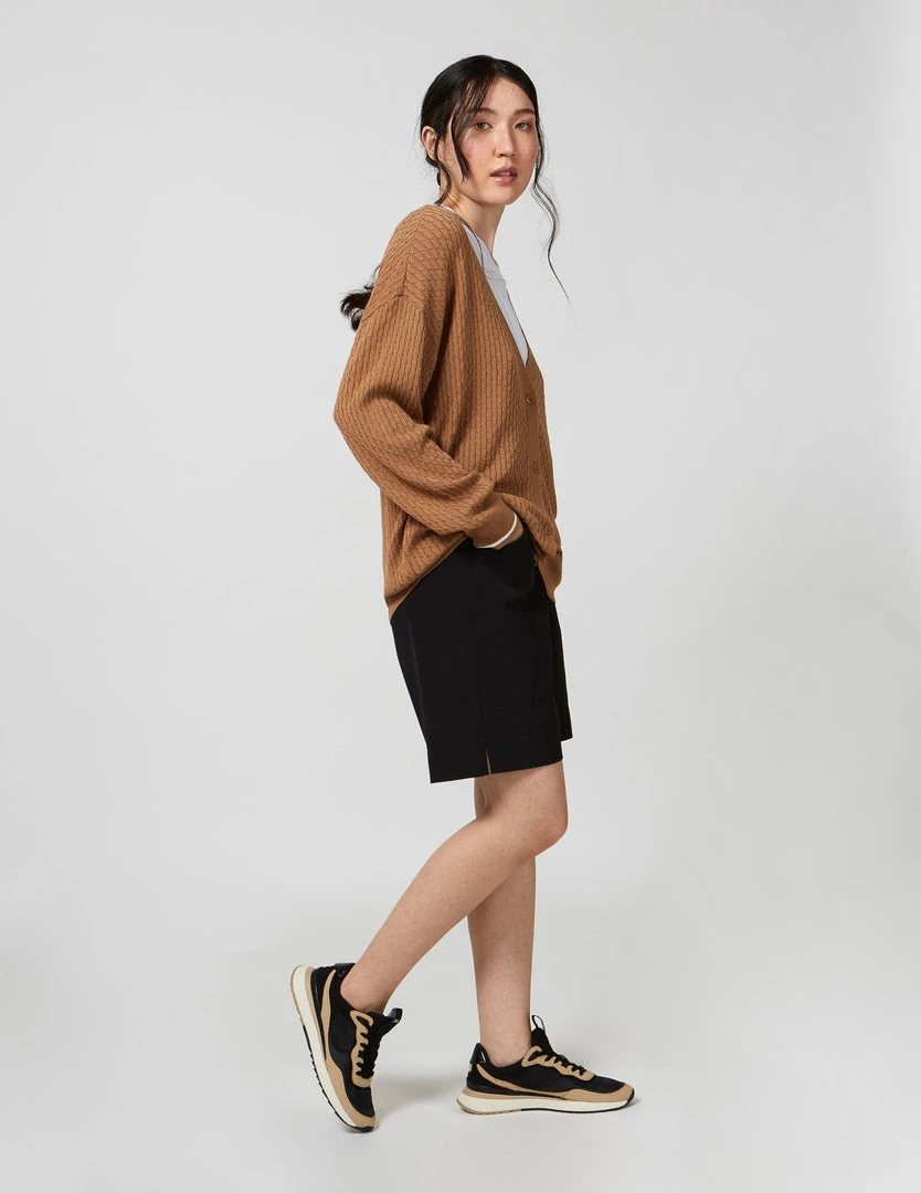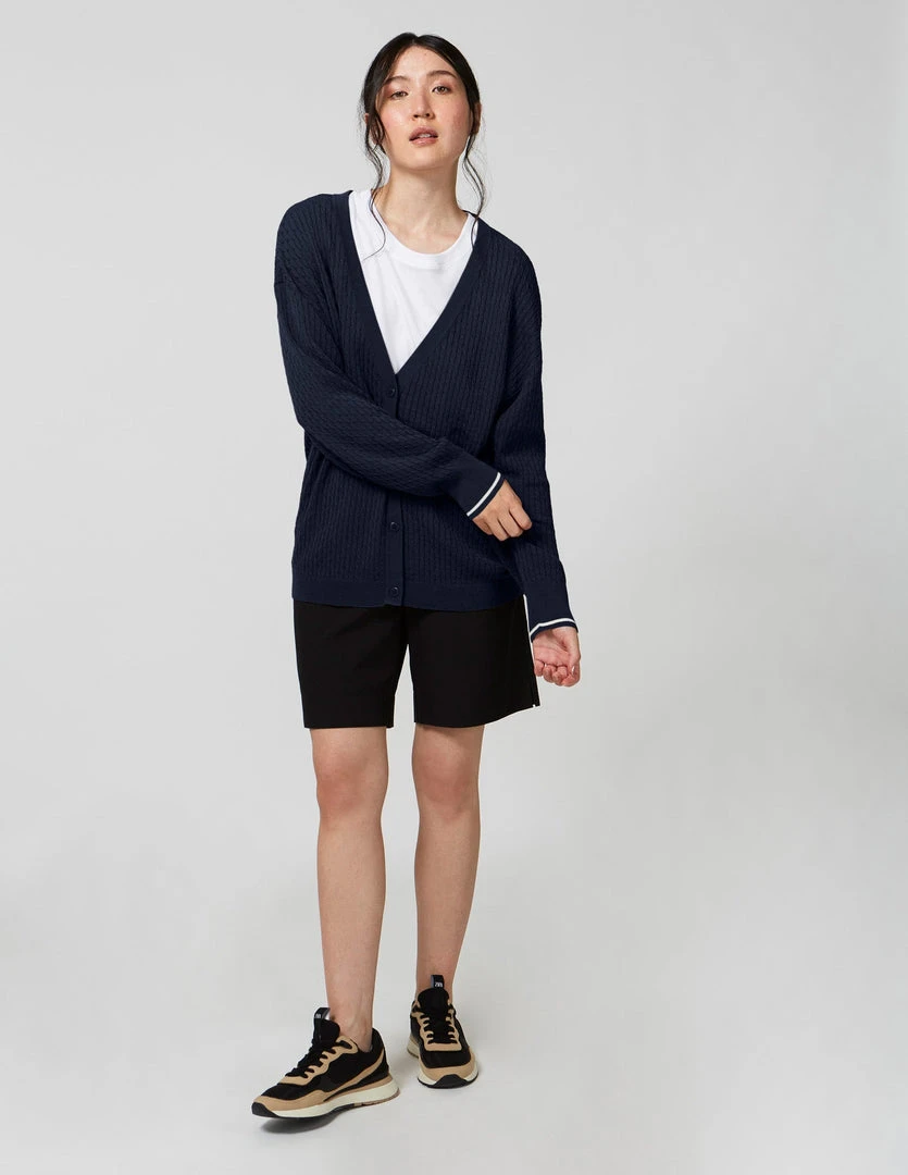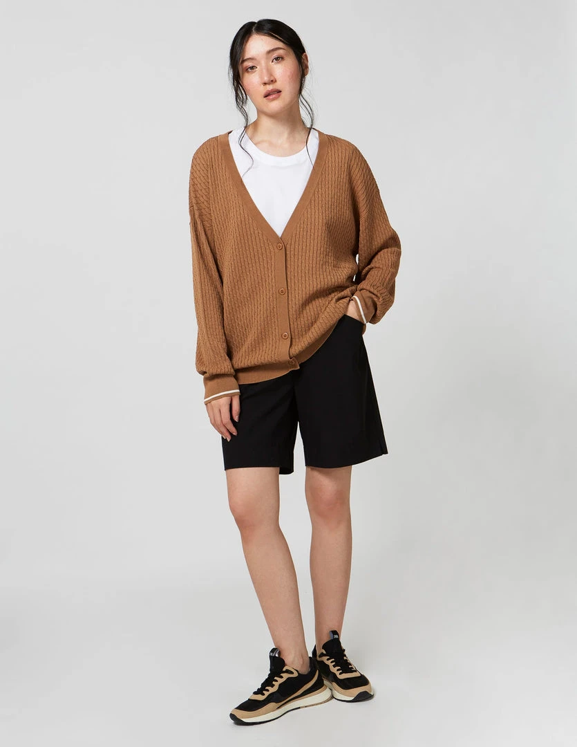 FIG Courcelles Cardigan, a long sleeves cardigan with button closure made with TENCELâ„¢ Modal, sourced from sustainable beech wood and produced in an environmentally responsible pulp to fiber process. Cable knit cardigan with dropped shoulder sleeves and rib at hems.