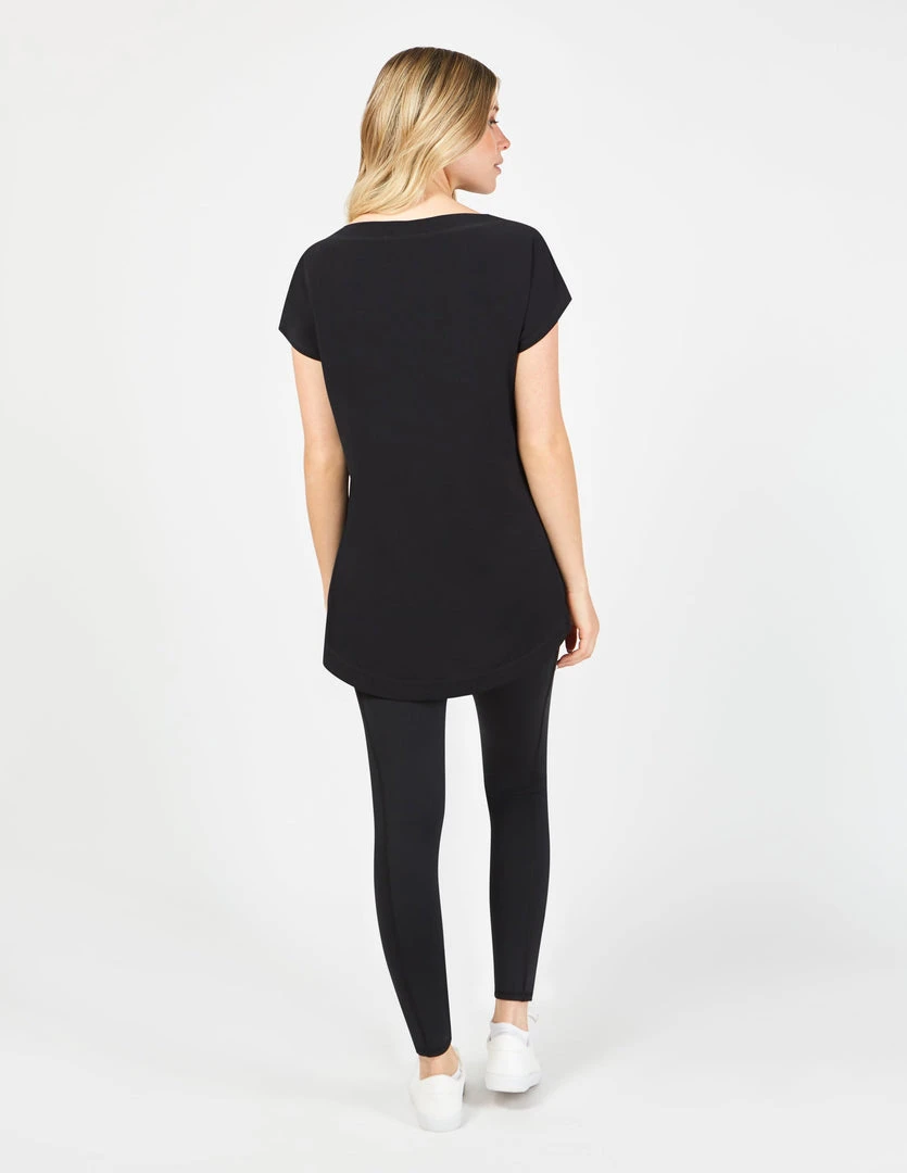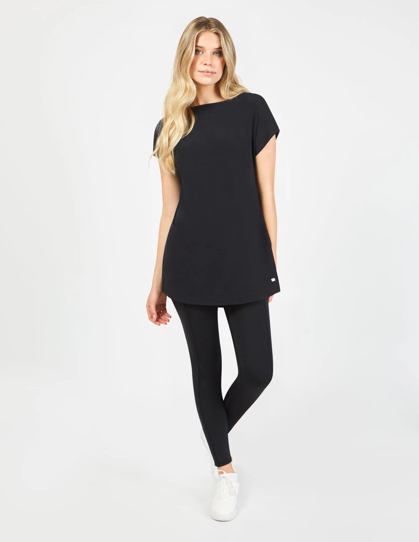 The Harrow Tunic Dress. Boat neck collar tunic made with TENCEL™ Modal, sourced from sustainable beech wood and produced in an environmentally responsible pulp to fiber process, and with Möbius LT, made with recycled polyester, created by using post-consumer plastic bottles. Boxy fit tunic with short sleeves, side-seam pockets, curved hems, and Möbius LT fabric at back panel.
