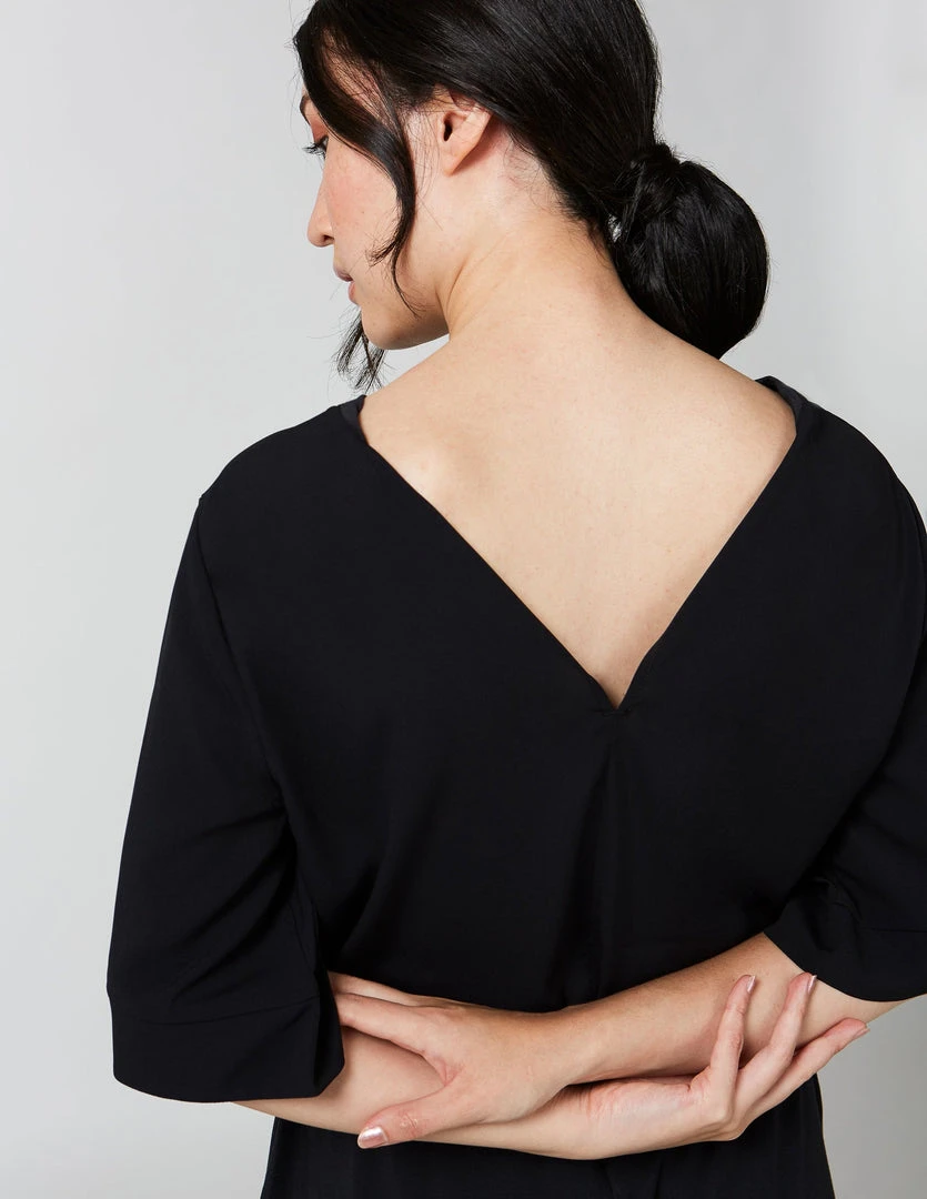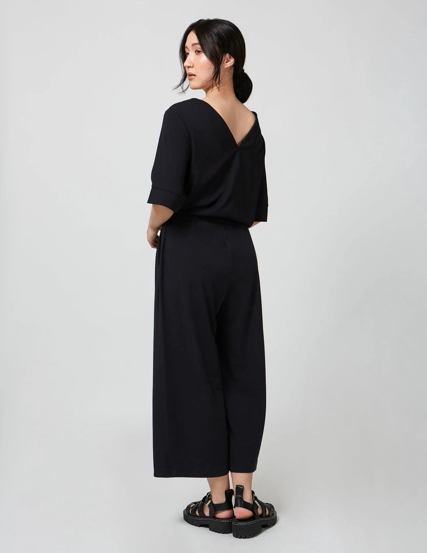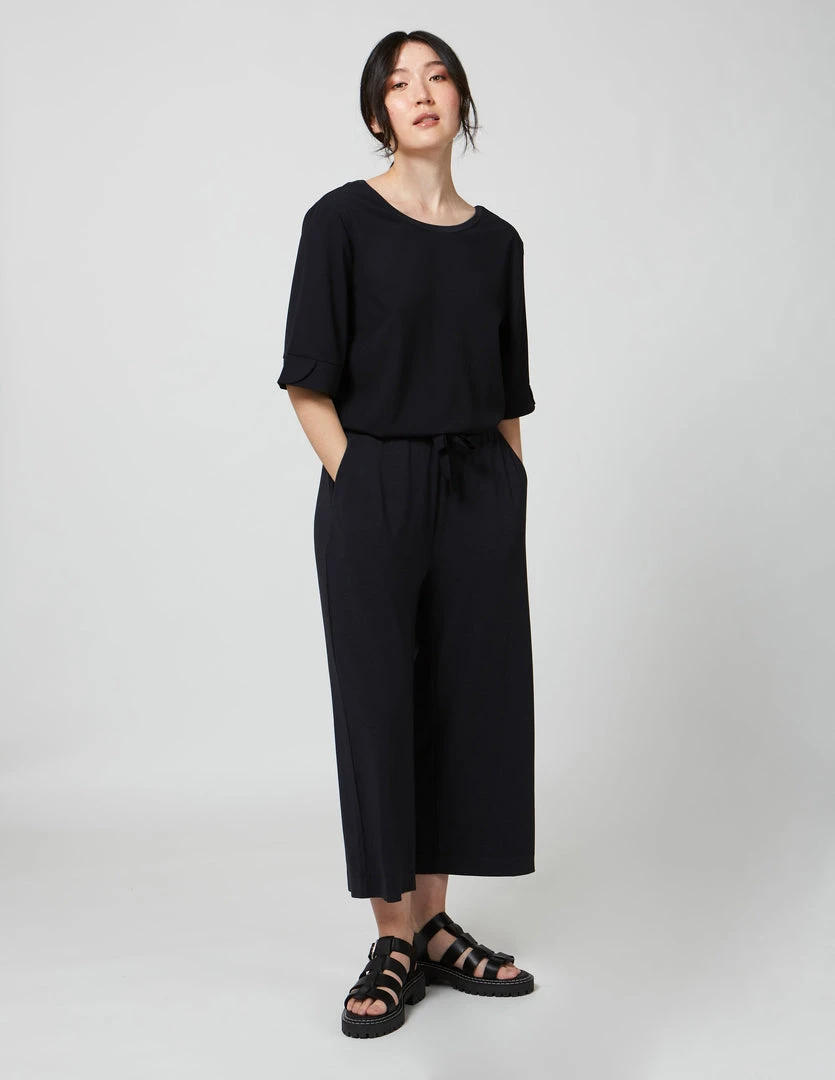 A jumpsuit with round neckline and keyhole closure at back made with TENCEL™ Modal, sourced from sustainable beech wood and produced in an environmentally responsible pulp to fiber process, and with Möbius LT, made with recycled polyester, created by using post-consumer plastic bottles. Wide legs jumpsuit with Möbius LT fabric on the top part and TENCEL™ Modal fabric at legs, elbow sleeves length, slant pockets, and drawcord and elastic band at waist.