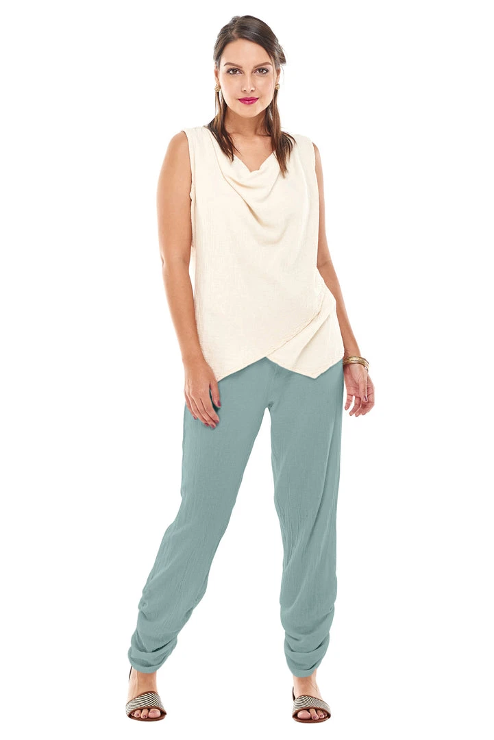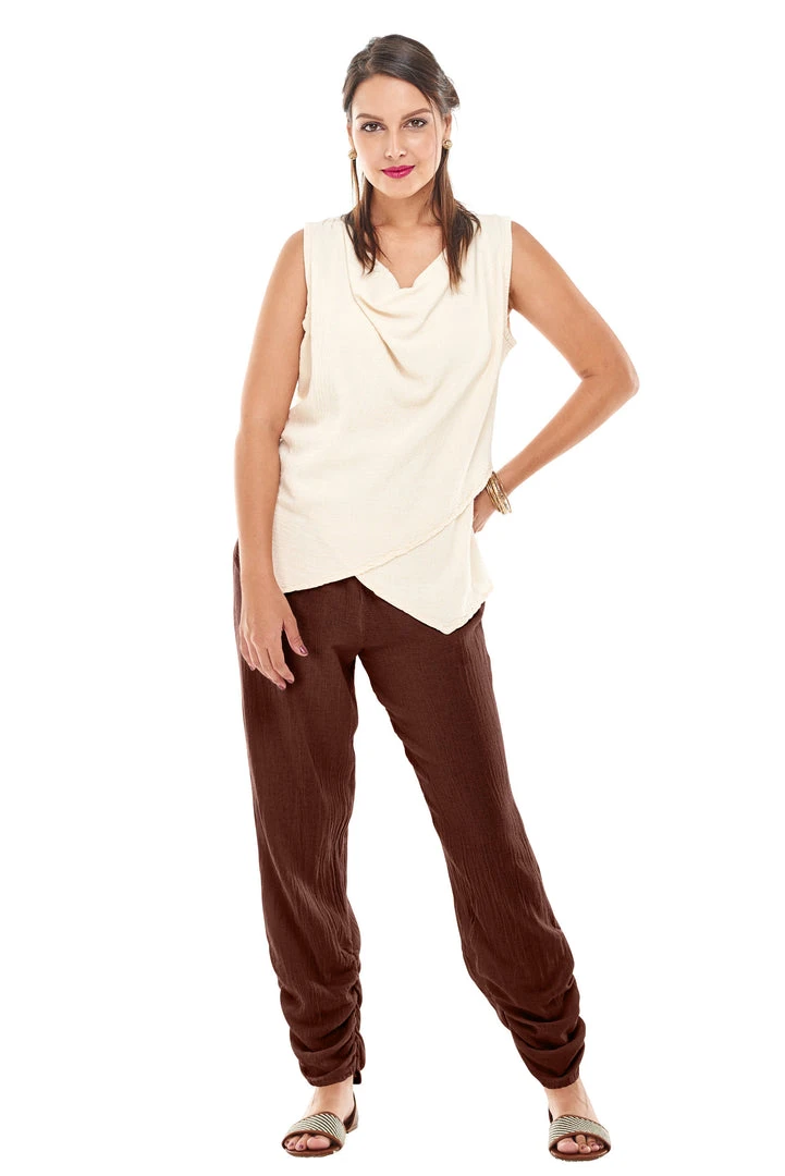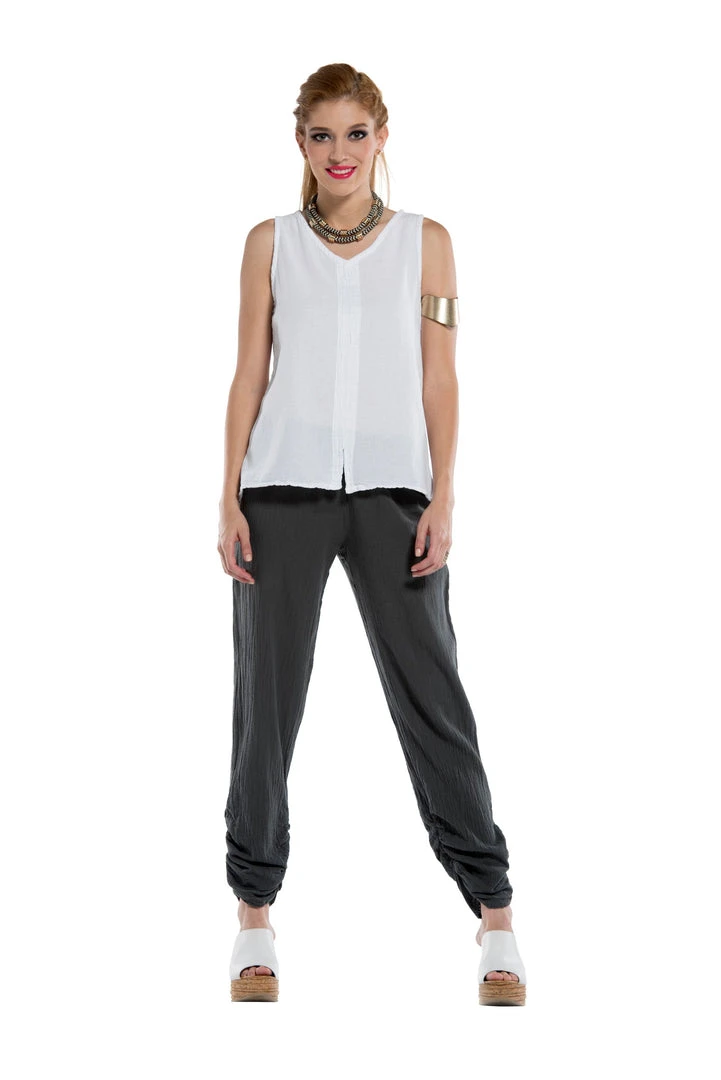 A slender fitted cotton gauze pant with a ruched hem bottom, great paired with our longer, fuller tops.