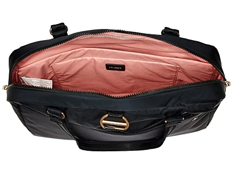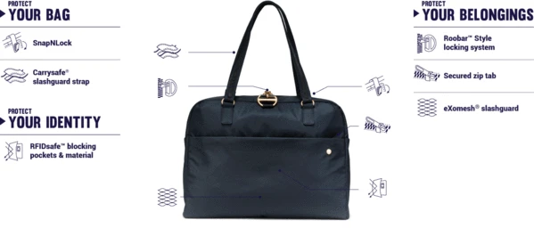 - Zippered main compartment complete with 2 slip pockets, RFID blocking zippered pocket, tablet sleeve and laptop compartment