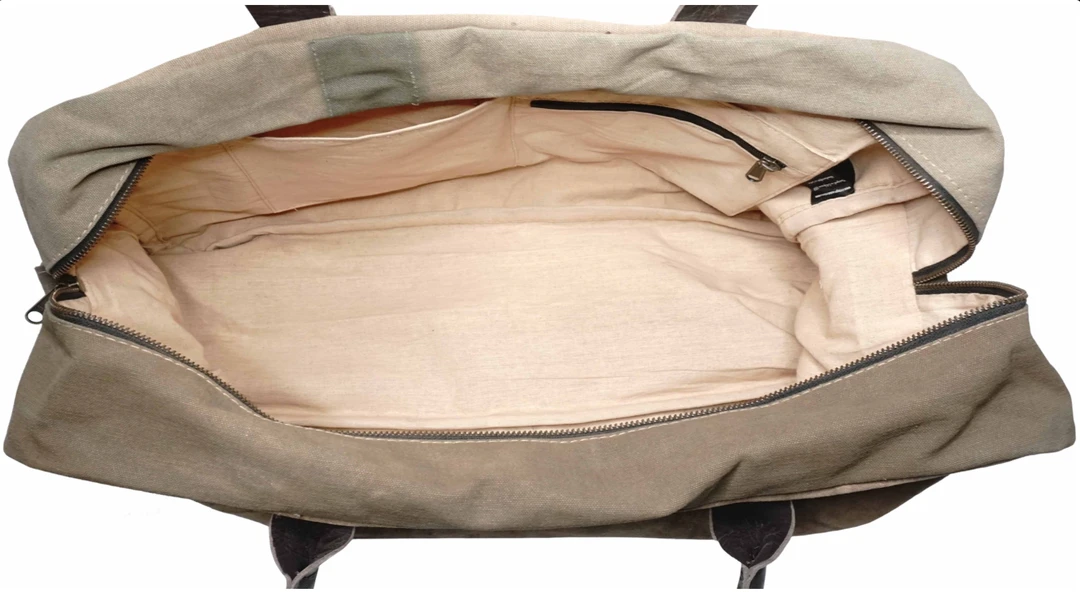 This eco-friendly travel bag is handcrafted from recycled military tents making each bag slightly unique. Bag is fully lined, features vintage-inspired prints as well as a generous zipped compartment on the back exterior and a zipped pocket on the front exterior. The interior has two pockets, one zipped and one open pocket. Each has durable genuine leather handles and an adjustable shoulder strap.