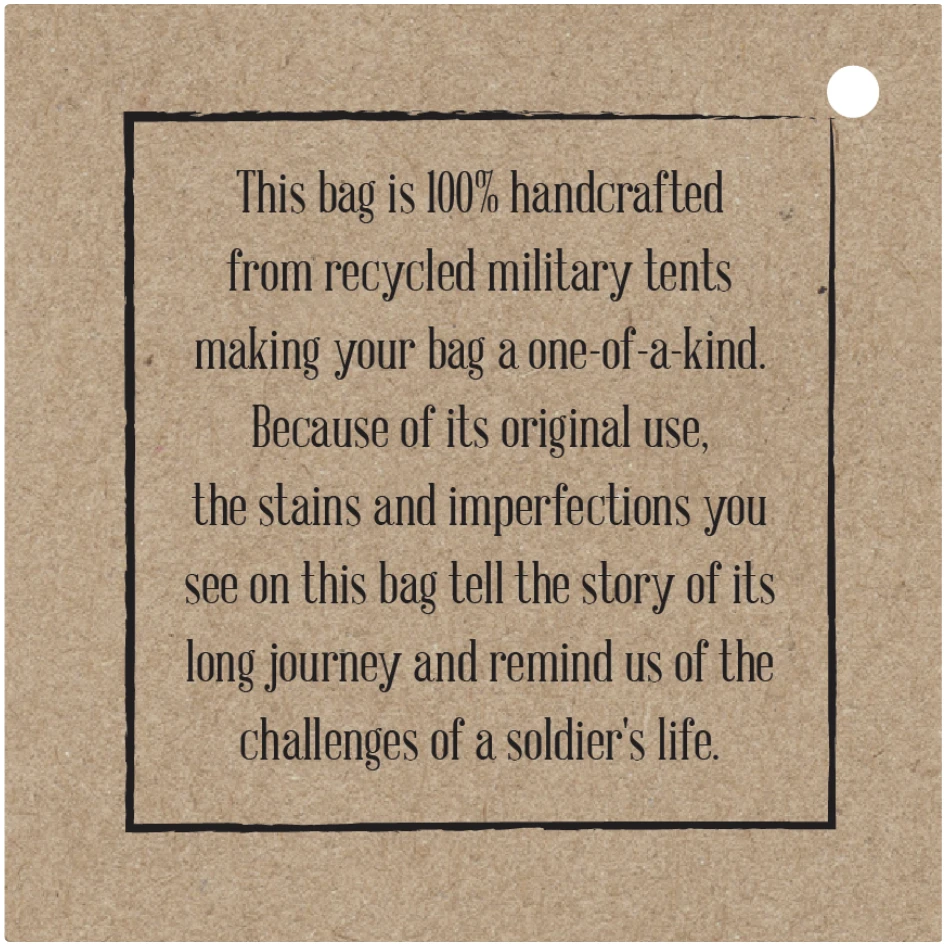 DISCLAIMER: Our recycled military tent bags are a tribute to and a reminder of the sacrifices and contributions of military veterans. Please know that these bags are made from authentic used military tents and are not brand new canvas packaged as recycled tents or tarps. THESE ARE THE REAL DEAL!! As a result, the tent material will show signs of worn-like imperfections which add to its character. Each bag has differences in genuine imperfections, stains, and colors. Your bag will be as unique as each soldier’s experience when seeking shelter in these tents whether in the training field or in a combat zone. All Sales are Final.
