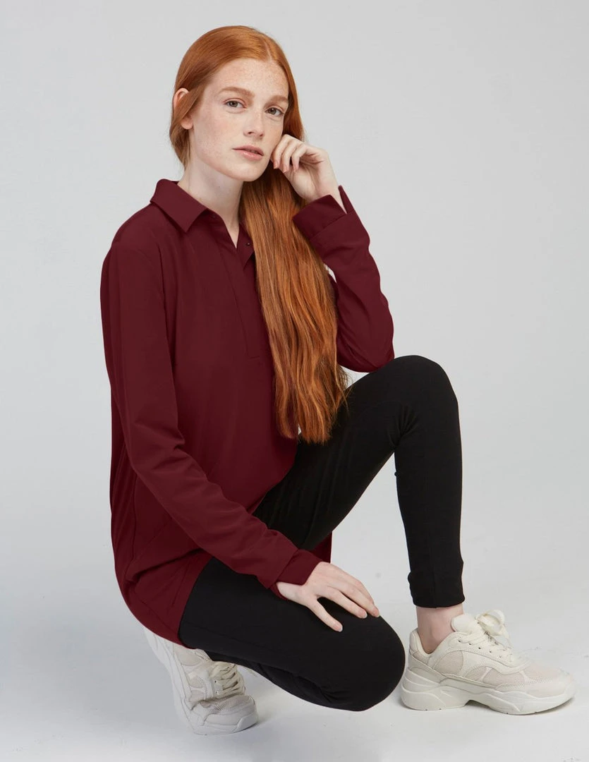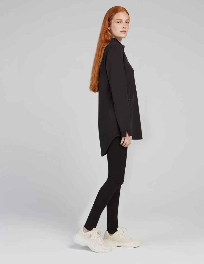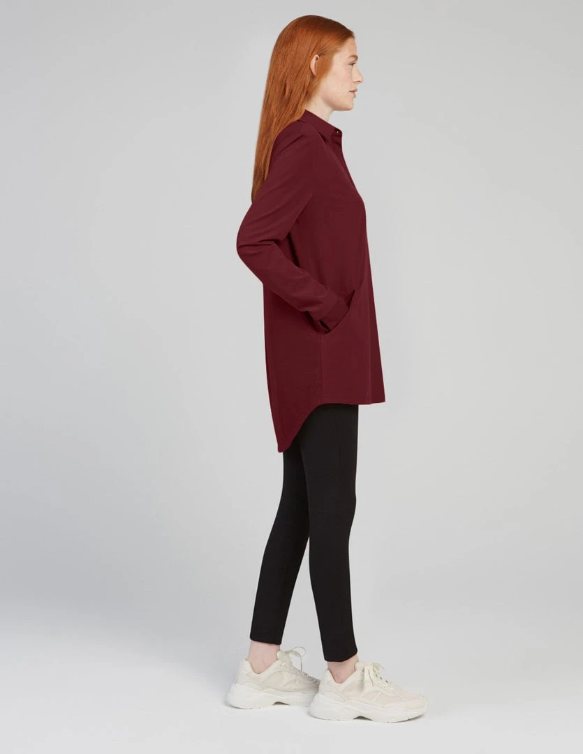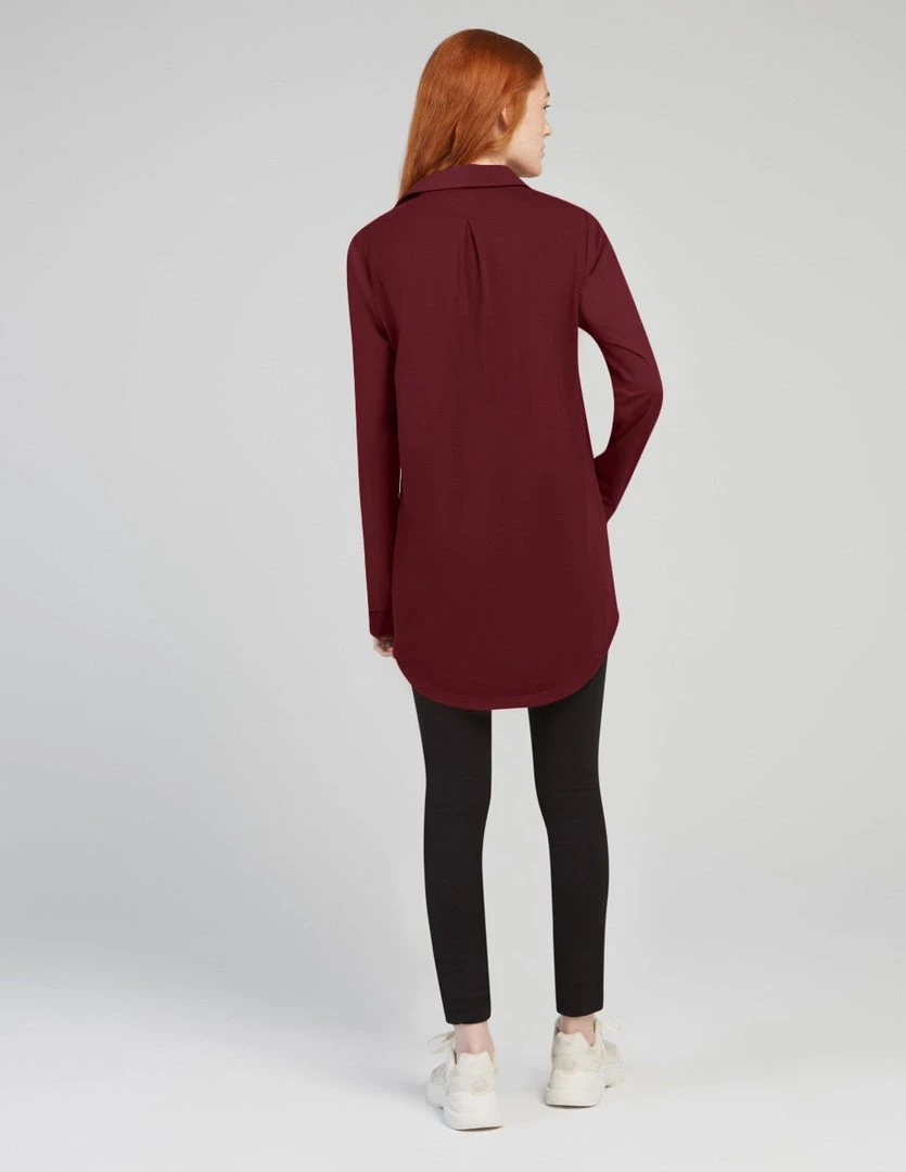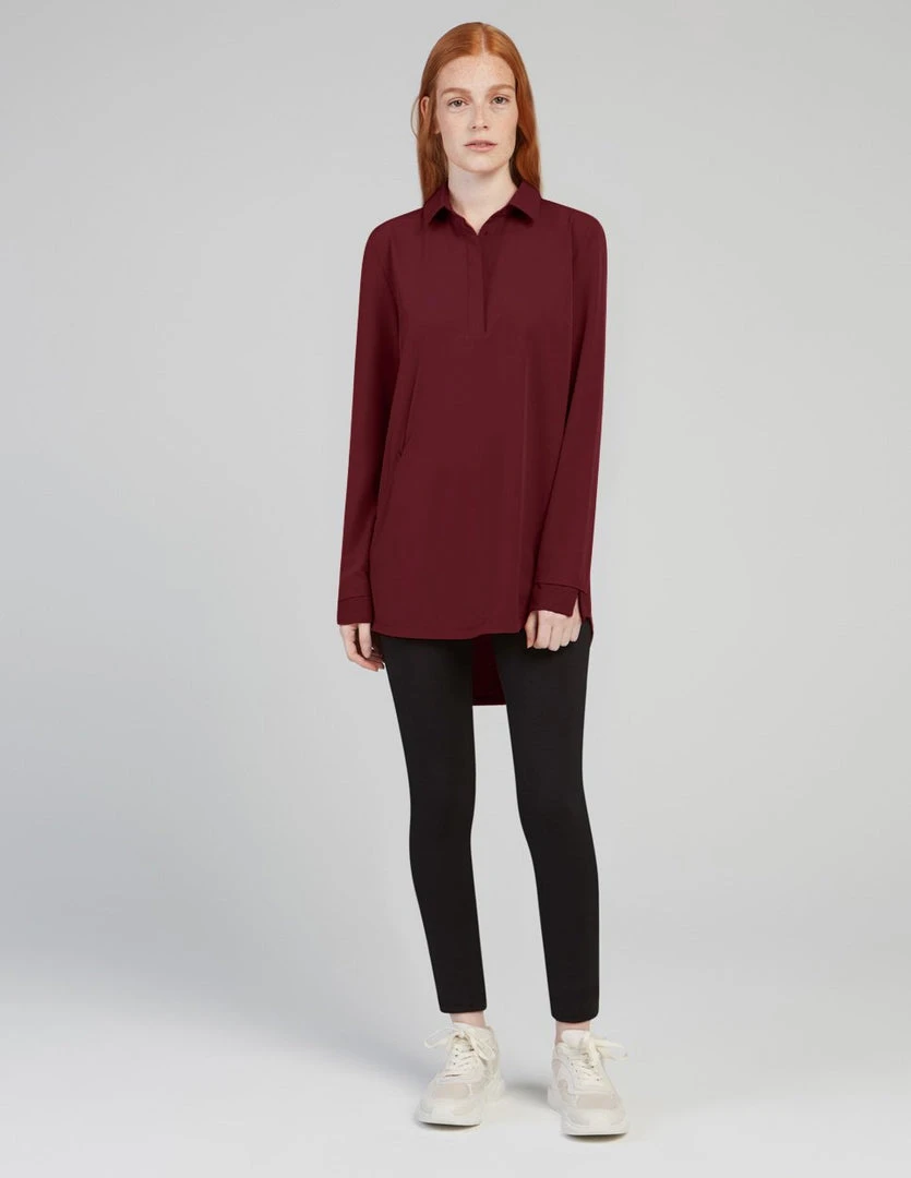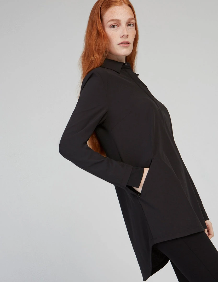 The Fig Mad Tunic. A stretch tunic with shirt collar made with drirelease® Eco, which is made with recycled polyester, and Repreve® certified recycled polyester, both created by using post-consumer plastic bottles. Tunic with hidden snap buttons under front placket and front pocket with invisible YKK® zipper. Front and back curved hems, sleeve cuffs with slit, and box pleat at back neckline.