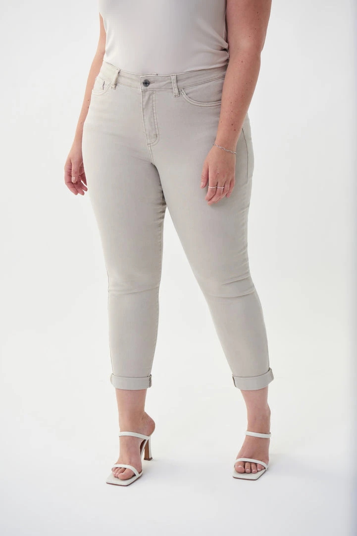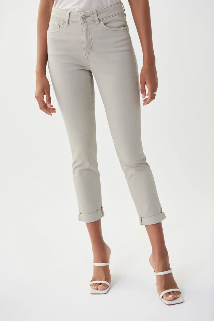 Can’t top a classic! This Joseph Ribkoff cropped denim pant is an everyday essential—a staple in every way with its five-pocket construction and rolled hem.