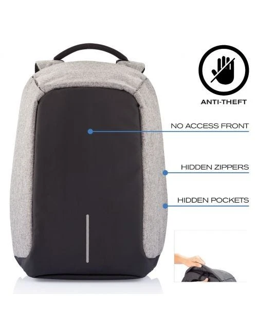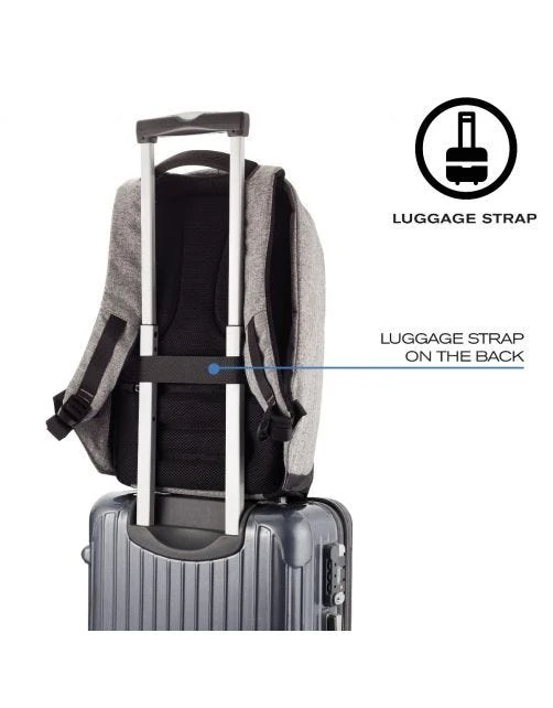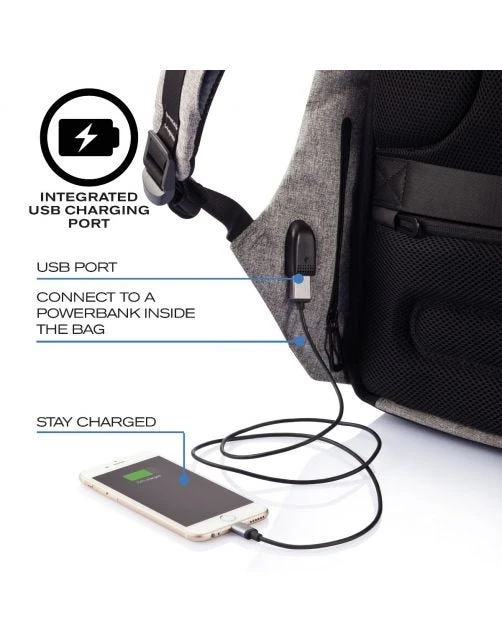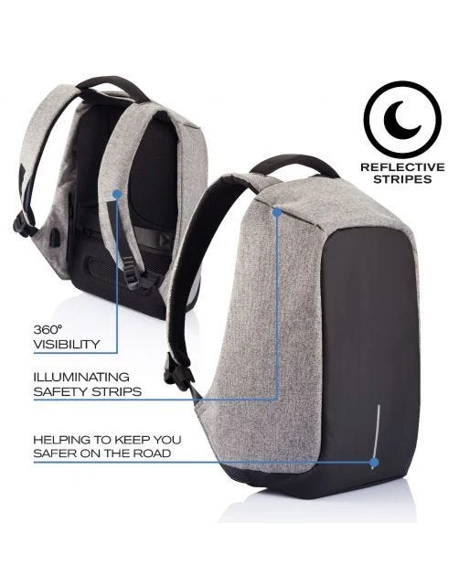 Features include Hidden Zippers & Pockets, Cut resistant, Integrated USB charging port, Optimal Weight balance, Water repellent fabric, Illuminating safety stripes, shock proof compartments, Luggage strap, Fits a 9.7″ Tablet (tablet compartment), Fits a 15.6″ Laptop (laptop compartment)
